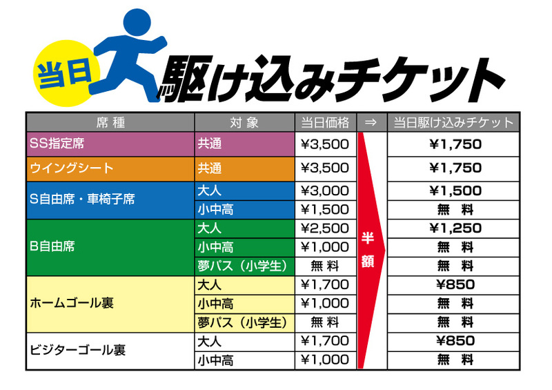 「当日駆け込みチケット」は、前半終了後から「当日券価格を半額(小中高生は無料)」にし、仕事や部活動などで『キックオフに間に合わない・・・』と来場を見合わせていた方に、『後半だけでも観戦に来ていただきたい』という想いを込めた割引チケットです。