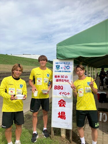 9月21日(日)に道の駅きつれがわが主催する「さくら市制20周年お祝いイベント 暑さに勝つぞBBQ!!」が行われ、栃木SCからは青島太一選手、川名連介、太田龍之介選手、トッキーが参加しました。