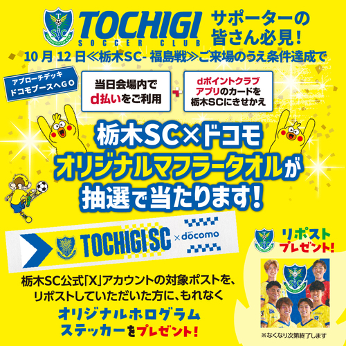 栃木SCホームゲーム(10月12日福島戦)にて、NTTドコモの特設ブースが設置されますので、お知らせいたします。