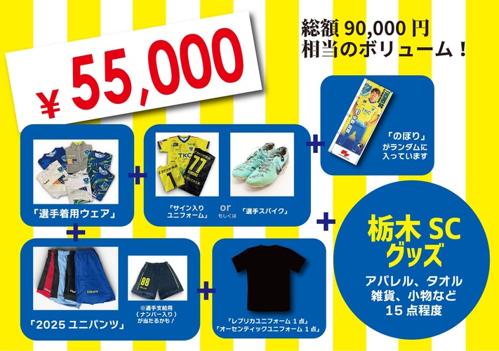 「選手着用ウェア 1点」もしくは「2025ユニフォームパンツ 1点」+「レプリカユニフォーム1着」+「栃木SCオリジナルグッズ15点程度」 、総額60,000円以上のボリューム!