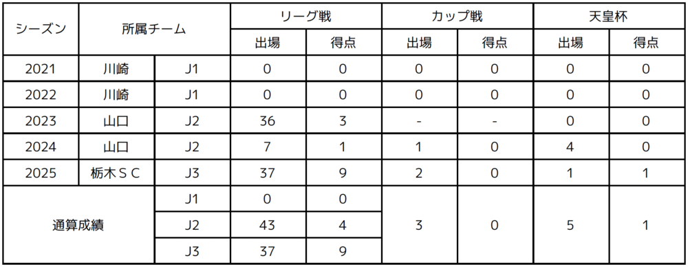 【経歴】 SCH FC→川崎フロンターレU-12→川崎フロンターレU-15→川崎フロンターレU-18→川崎フロンターレ→レノファ山口FC→栃木SC