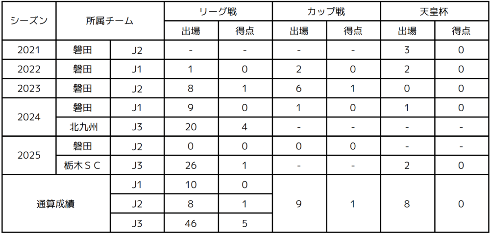 バディFC→ジュビロ磐田U-15→ジュビロ磐田U-18→ジュビロ磐田→ギラヴァンツ北九州→ジュビロ磐田→栃木SC