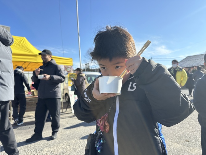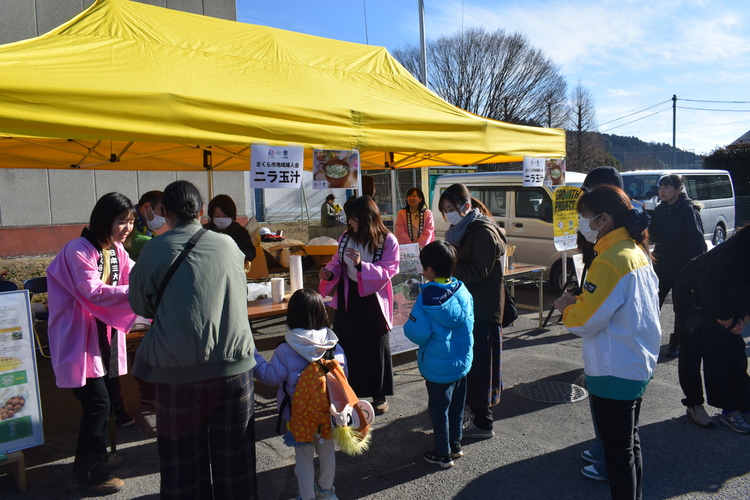 さくら市さんのご厚意で、さくら市産のニラ・卵・手作り味噌を使った「ニラ玉汁」をご提供いただきました。朝早くから、さくら市婦人会のみなさまが調理してくださり、参加者の身も心も温めてくださいました。