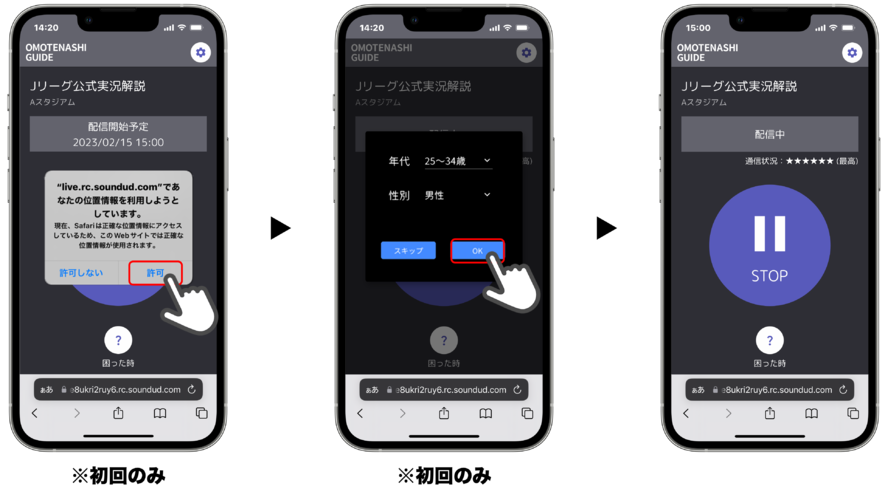 ②スマートフォンの位置情報利用を許可し、年齢・性別を登録(スキップ可能)