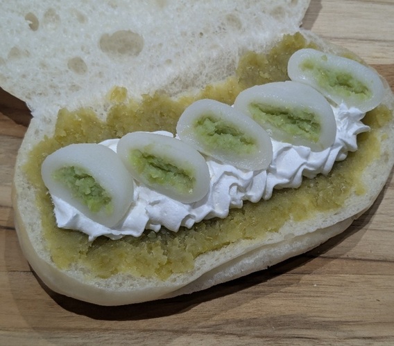 仙台グルメでスイーツと言えばずんだ餅ですが、コッペパンに合うずんだの餡を塗ってホイップの上にずんだ餡入りのお餅をトッピングした美味しい組合せです。