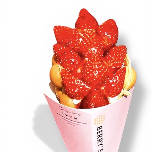 もちもちとしたバブルワッフル生地に、甘さ控えめのクリームと自慢のいちごをトッピングした写真映え間違いなしのバブルワッフル!