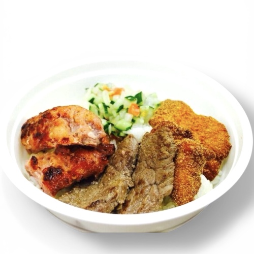 ブラジル料理店ダ・ネイデ一番人気の「ブラジル丼」はチキンカツ、牛ステーキ、ブラジリアンソーセージが乗っていてボリューム満点!