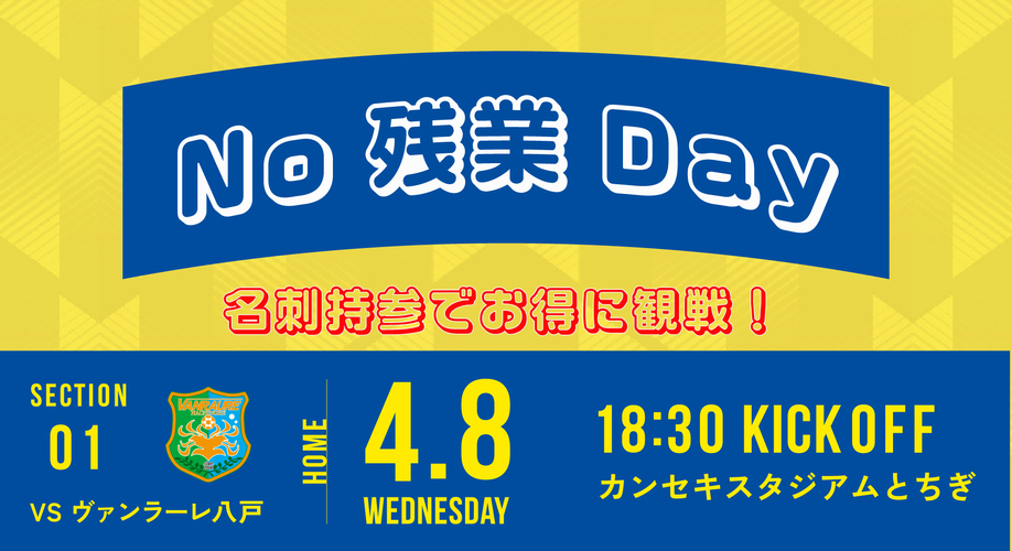 積雪の影響で中止となり、平日ナイターゲーム開催となる第1節ヴァンラーレ八戸戦において、「No残業Day」企画を実施いたします。