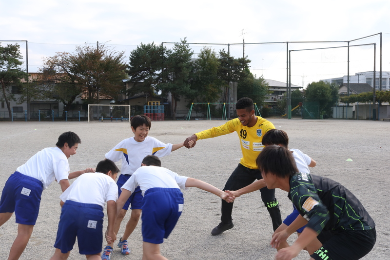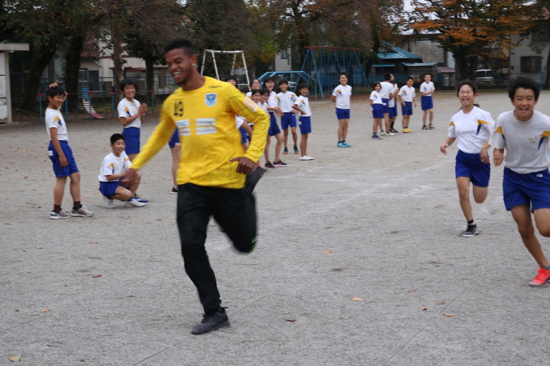 準備運動では、ランニングや鬼ごっこなどをしてウォーミングアップを行いました。選手から積極的にコミュニケーションをとり、アップから選手と生徒たちはとても楽しそうに触れあっていました。