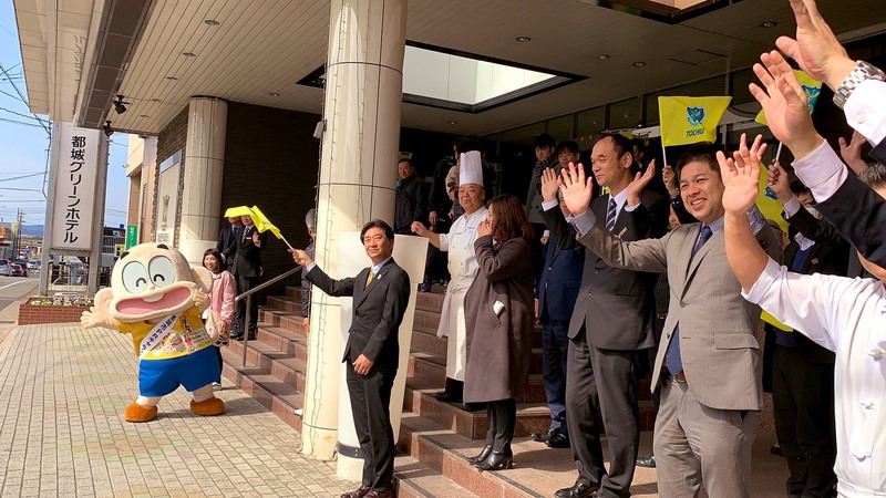 宿泊先としてお世話になった都城グリーンホテルにも皆さんが駆けつけてくれました。おなじみのダブル「ぼんちくん」!