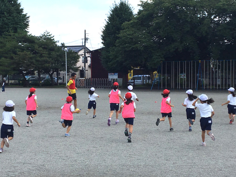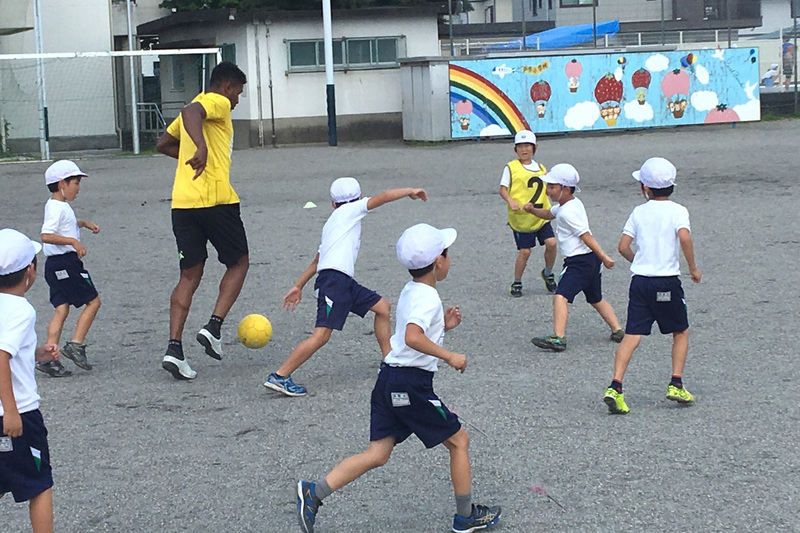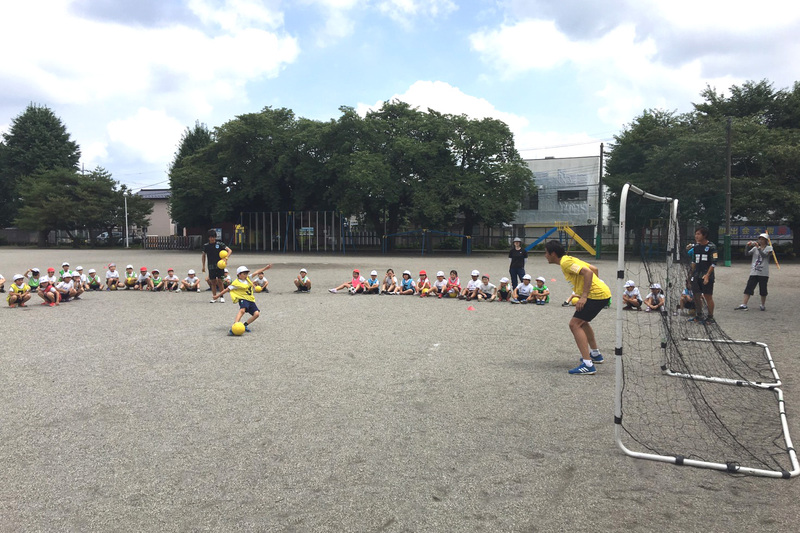 男の子も女の子も白熱したゲームとなりました。みんな夢中でボールを追いかけ、生徒たちは楽しそうに選手と一緒にボールを追いかけサッカーを楽しんでいました。
