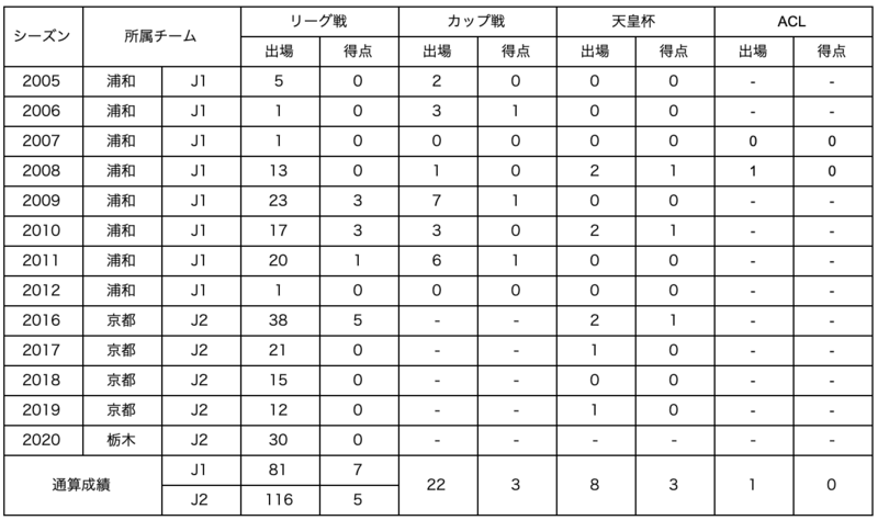 【経歴】浦和レッズユース→浦和レッズ→FCソウル(大韓民国※期限付き移籍)→浦和レッズ→FCソウル(大韓民国)→江蘇舜天/江蘇蘇寧(中国)→京都サンガF.C.→蔚山現代FC(大韓民国※期限付き移籍)→ 京都サンガF.C.→栃木SC