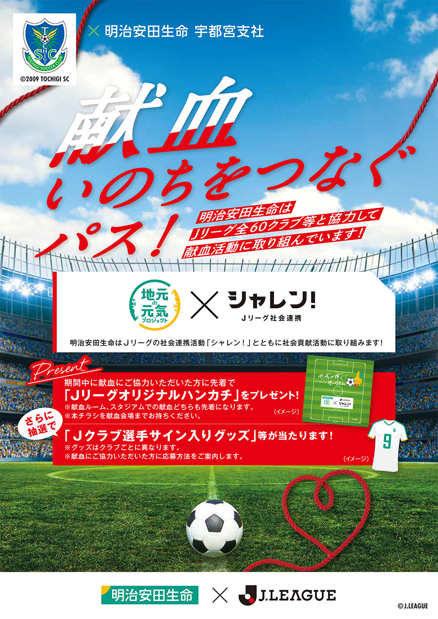 6月24日(土)山口戦では、Jリーグのシャレン!活動の一環として、栃木SCのパートナーである明治安田生命宇都宮支社様と栃木県赤十字血液センター様と協働で、「シャレン!で献血」を実施いたします。