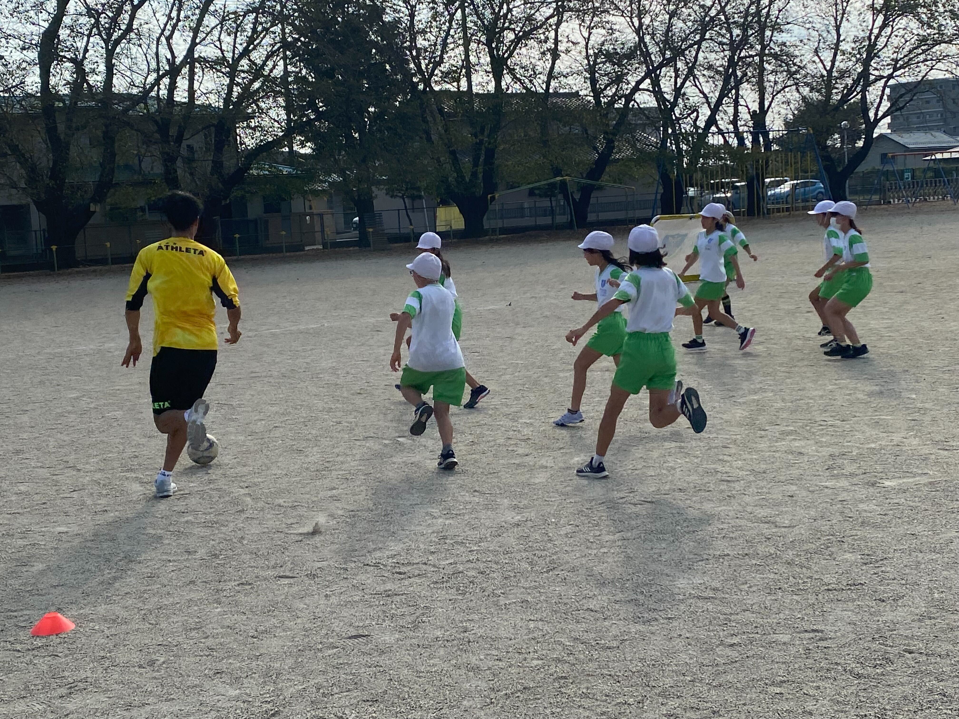 みんなでひとつのゴールを狙います!選手のドリブルをみんなで止めに行きます。