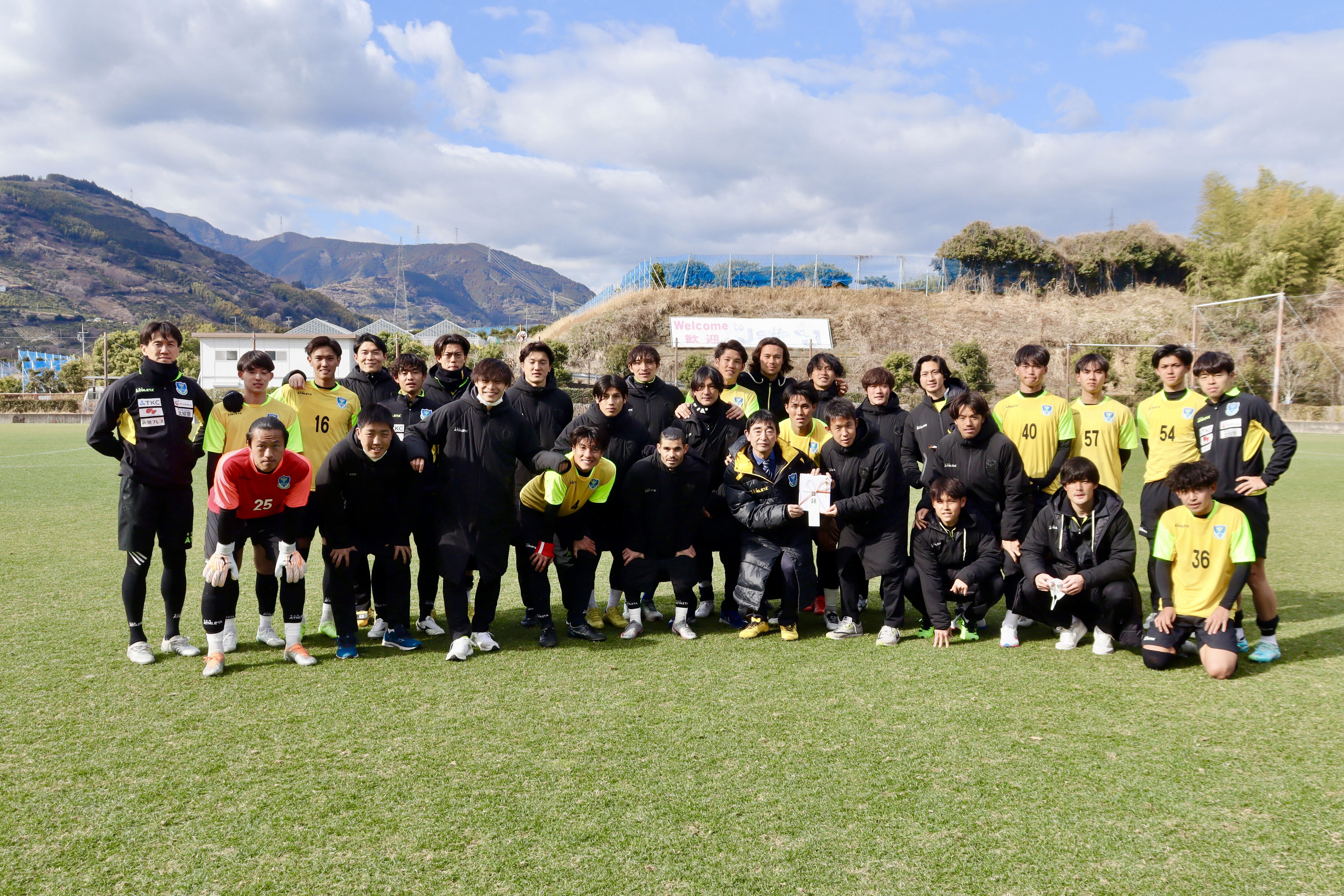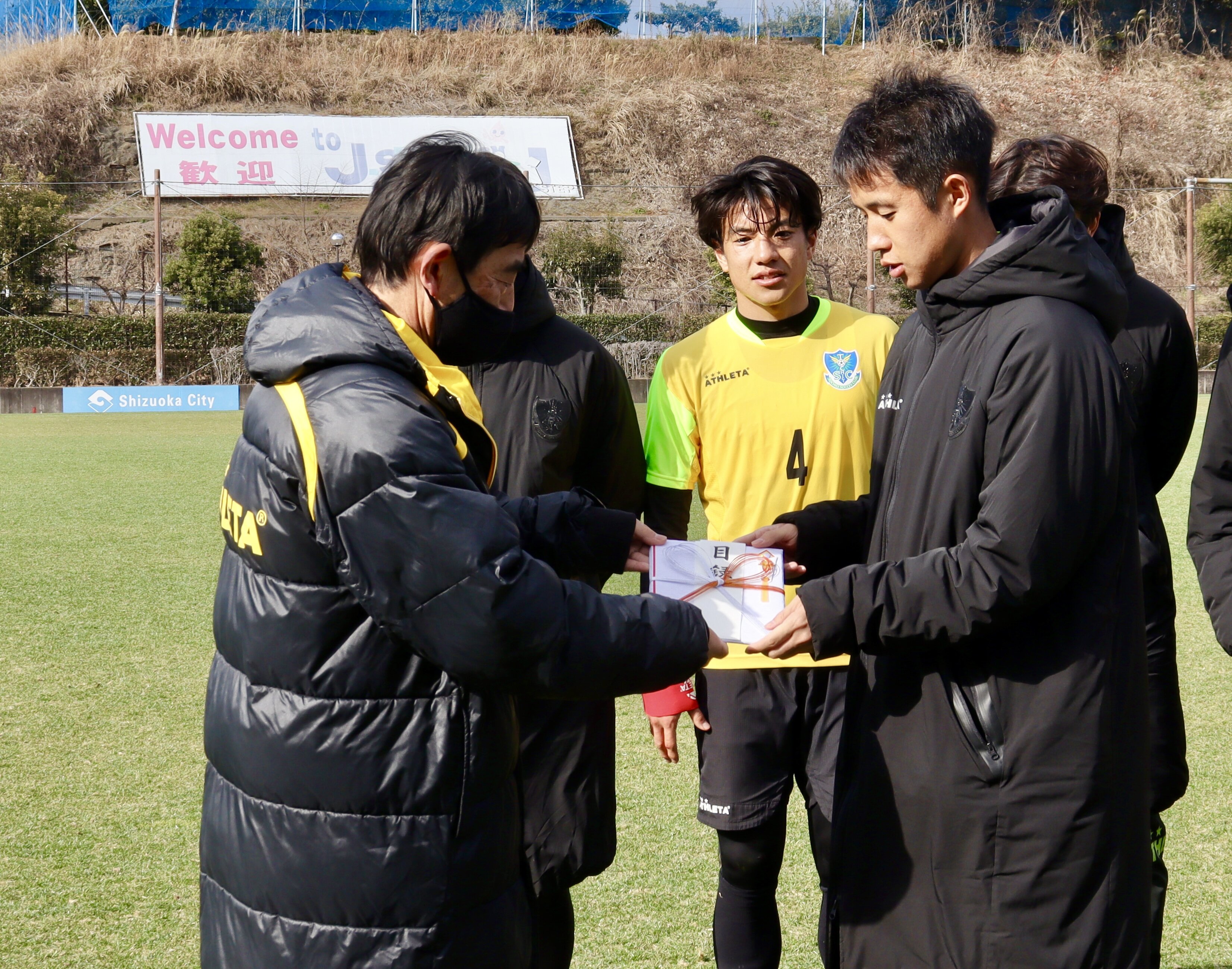 1月31日(火)にキャンプ地にて、栃木サッカークラブ後援会からの今回のキャンプに対する激励金が上野勝弘後援会長から栃木SC選手会長の大島康樹選手に手渡されました。