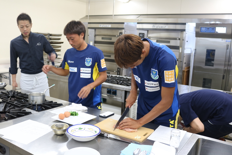 今年2回目のとなった料理教室は8月10日(木)にIFC栄養専門学校様に会場をお借りして行われました。福岡将太選手・川田修平選手・和田達也選手・種岡岐将選手・藤沼拓夢選手が参加し宇都宮市の洋食レストラン「Naomi OGAKI」のオーナーシェフ・大垣直巳氏を講師に招き料理を学びました。