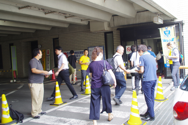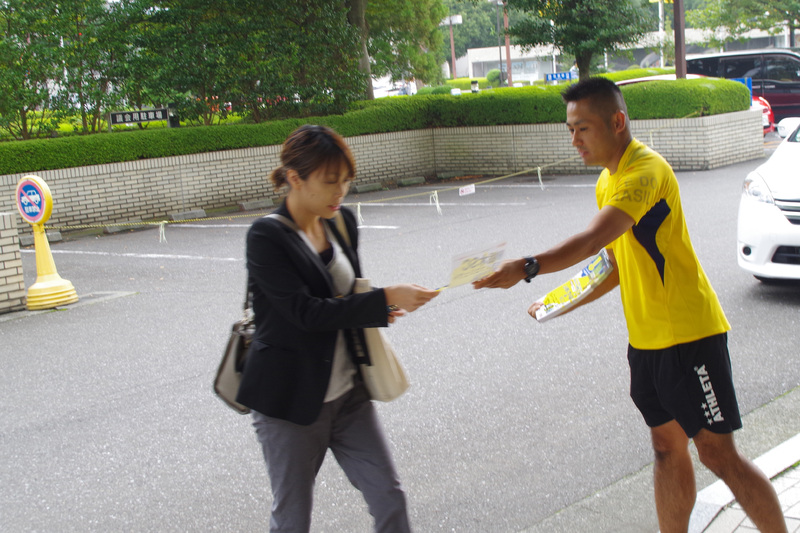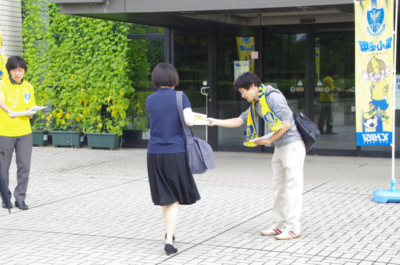 朝8時過ぎになるとたくさんの市役所職員の方々が出勤します。クラブスタッフそして宇都宮市職員有志のみなさんが声を出し、力を合わせてチラシ配布することにより多くの職員の方々に試合の呼びかけを行うことができました。
