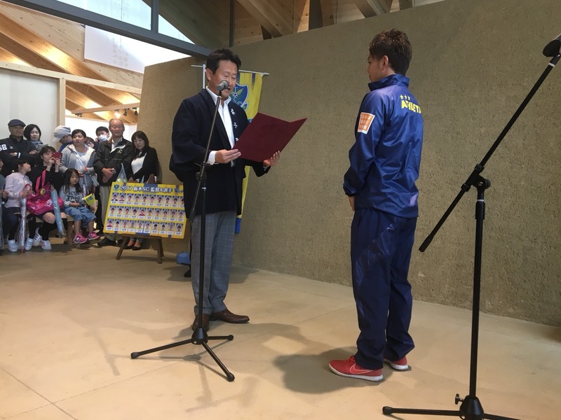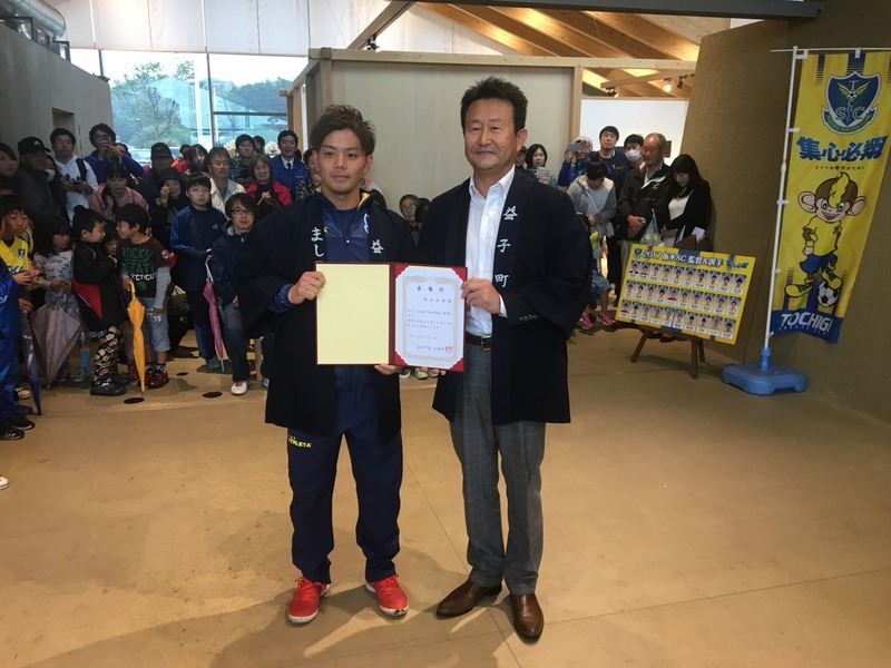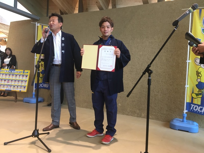 10月15日(日)に 栃木SCと地域支援パートナーシップを締結しています益子町で行われた「道の駅ましこ1周年祭イベント」に西谷和希選手が参加し、益子町宣伝部長授与式が行われました。益子町出身の西谷和希選手が、200人近く集まったサポーターの前で大塚朋之町長から委嘱状を渡されると会場から大きな拍手が沸き起こりました。