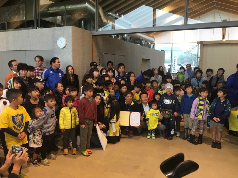 最後に大塚朋之町長、西谷和希選手をサポーターの皆さんが囲んでパシャリ。