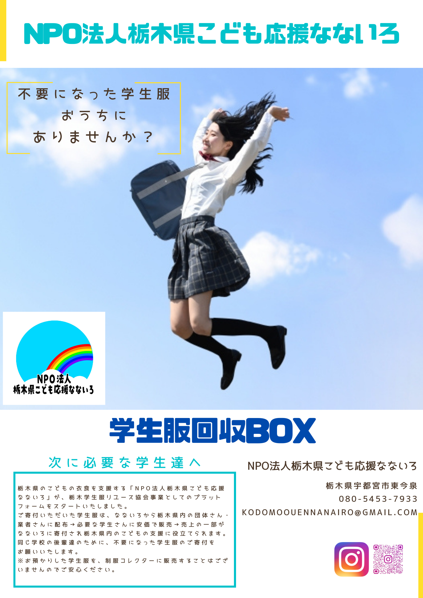 また、制服の売上の一部は「NPO法人栃木県こども応援なないろ」に寄附されます。その寄付金はなないろの活動を通して、栃木県のこどもの衣食・学習支援に役立てられます。