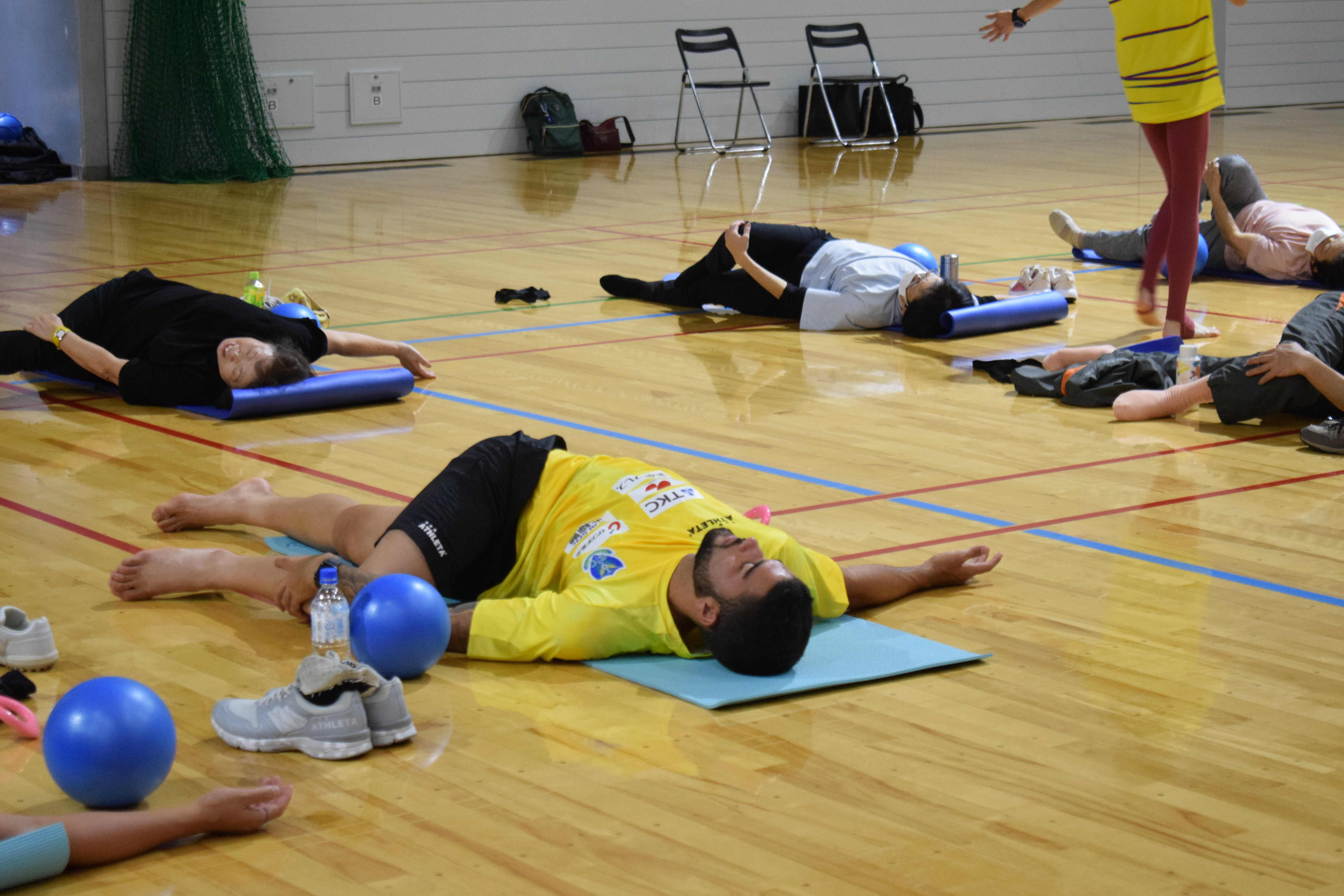 まずは森川純子トレーナーの指導で、ストレッチを中心に、自宅で実施いただける運動を重点的に行いました。