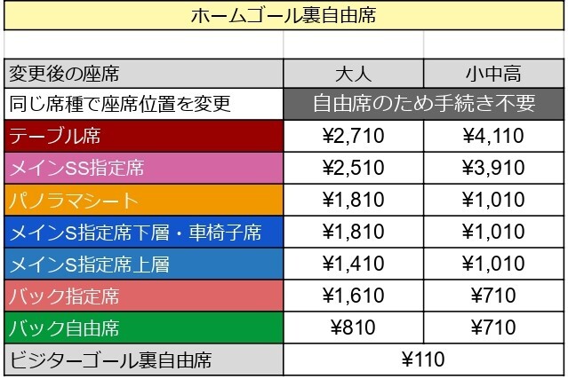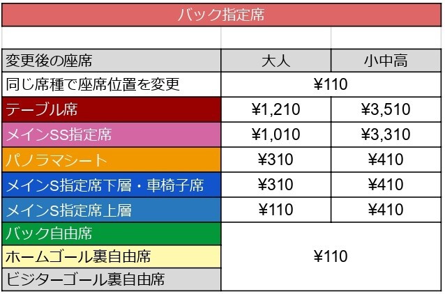 ※ダウングレードとなる場合(メインS指定席⇒バック自由席へ移動等)、差額の返金はいたしかねますので予めご了承ください。