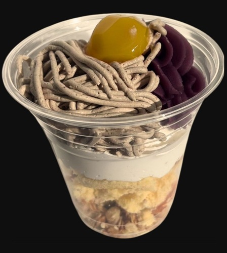 秋限定のマロンクリームと紫芋のあんこを使用をした秋の味覚を堪能できるカップパフェ。