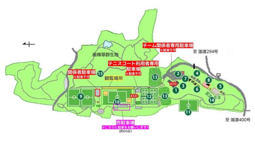 ・ご来場の際には、西側駐車場(約60台)をご利用ください。テニスコート側の駐車場等はご利用者さまがいらっしゃいますので駐車しないようお願いいたします。限られた駐車スペースとなりますので、お乗合等でのご来場をお願いいたします。