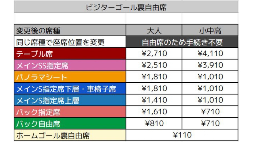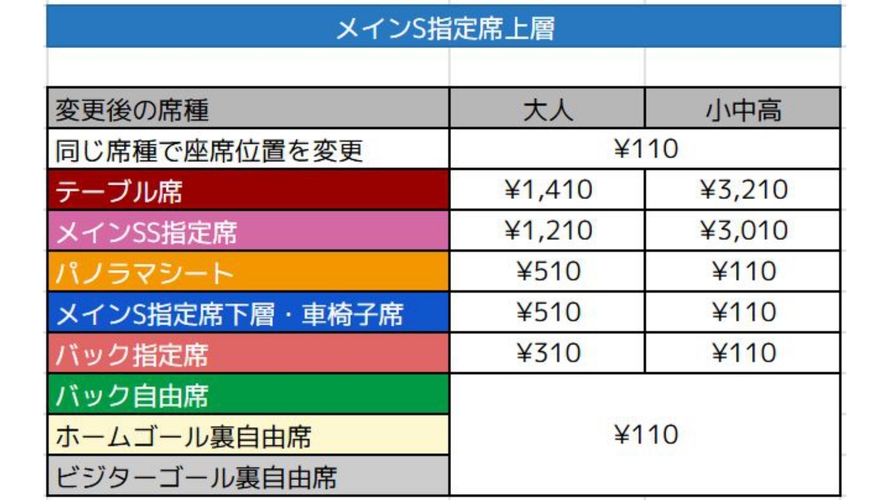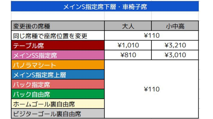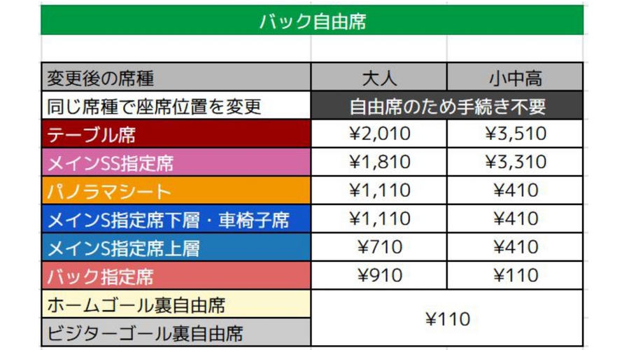※ダウングレードとなる場合(メインS指定席⇒バック自由席へ移動等)、差額の返金はいたしかねますので予めご了承ください。