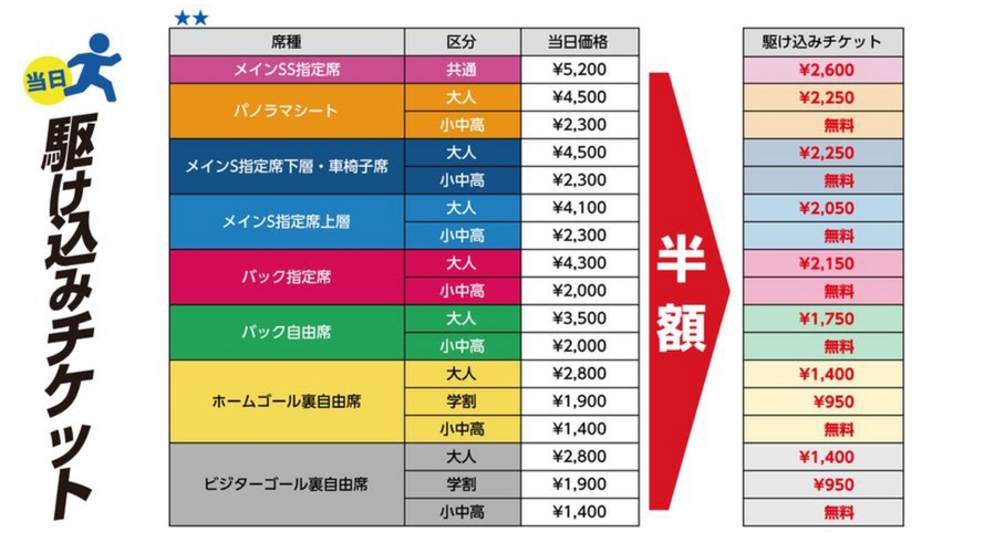 「当日駆け込みチケット」は、前半終了後から「当日券価格を半額(小中高生は無料)」にし、仕事などで『キックオフに間に合わない・・・』と来場を見合わせていた方に、『後半だけでも観戦に来ていただきたい』という想いを込めた割引チケットです。