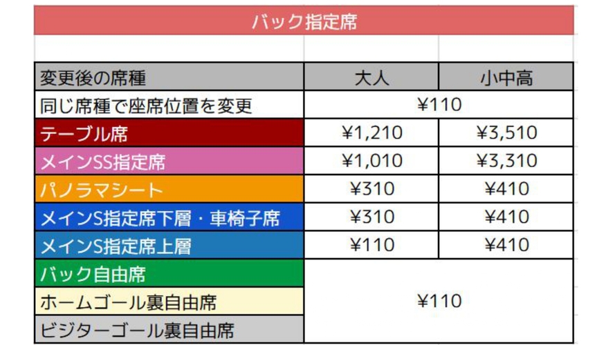 ※ダウングレードとなる場合(メインS指定席⇒バック自由席へ移動等)、差額の返金はいたしかねますので予めご了承ください。