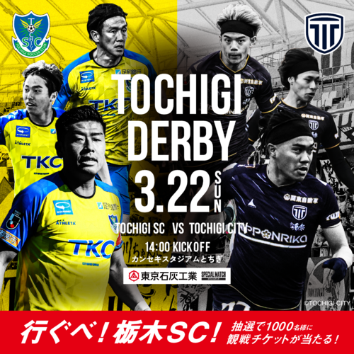この度、3月22日(日)に開催されます「栃木ダービー(栃木SC vs 栃木シティ)」におきまして、抽選で最大1,000名様へ観戦チケットが当たるご招待キャンペーン企画「行ぐべ!栃木SC!」を実施いたします。