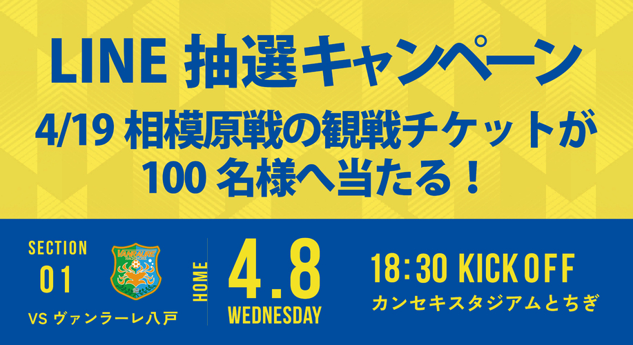 4月8日(水)ヴァンラーレ八戸戦では、ご来場いただいた方の中から抽選で100名様に4月19日(日)SC相模原戦の観戦チケットをプレゼントいたします。