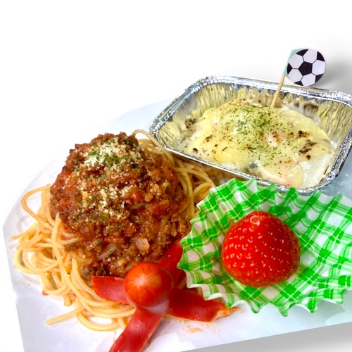 ミートソースパスタ、シーフードドリア、タコさんウインナー、栃木産いちごでお子様ランチに!