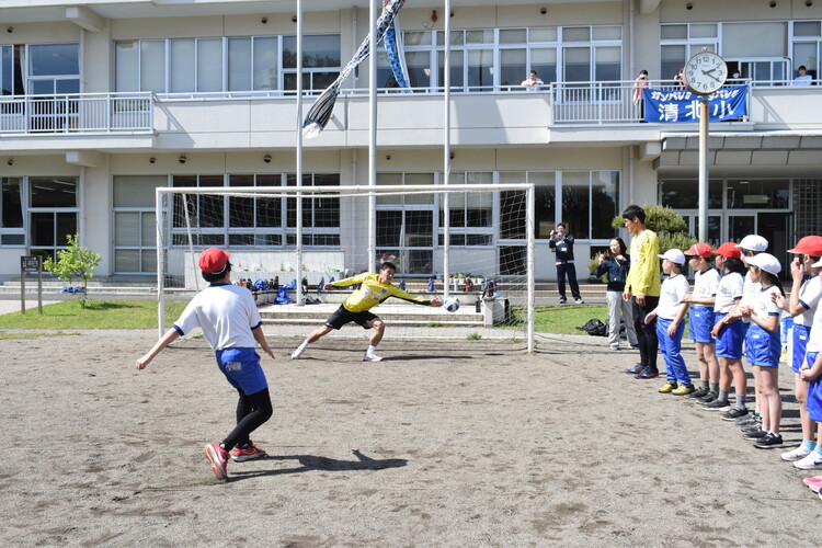 みんなの上手なシュートに、選手も本気でゴールを守ります。